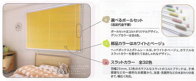 「コルト」は、ベーシックな無地スクリーン(全55色)で、しっかりとした質感ながら求めやすい価格を実現した人気シリーズです。従来はロールスクリーン、プリーツスクリーン、バーチカルブラインドに対応していましたが、ユーザーからのラインナップ拡充を求める声に応えるため、新たに横型アルミ製ブラインド(インテリアブラインド)を追加しました。ブラインドのスラット(はね)の開閉や上げ下げを行うポールセットはコルトオリジナルのかわいいデザインを採用し、好きなカラーが選べるオプションも設定しました。